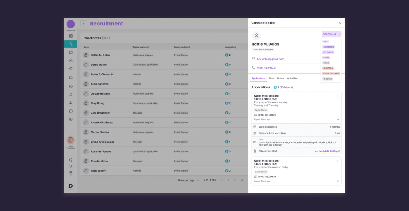 You now have access to an entirely new section dedicated to recruitment. A consolidated view of all your candidates allows you to compare, sort, and filter them according to your hiring needs. Managing your candidates in one centralized place enables smart and efficient management, saving you valuable time.