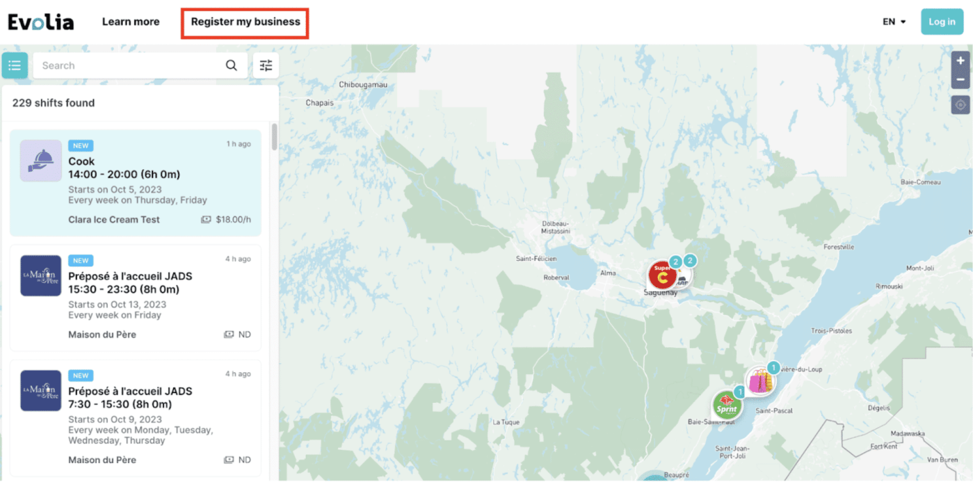 Navigate to the job board home page to Explore Evolia and see shifts on the map and jobs available for shift workers.