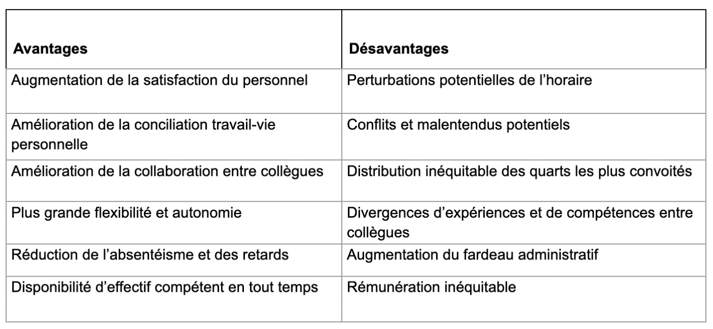 Voici un tableau présentant les principaux avantages et désavantages des échanges de quarts :