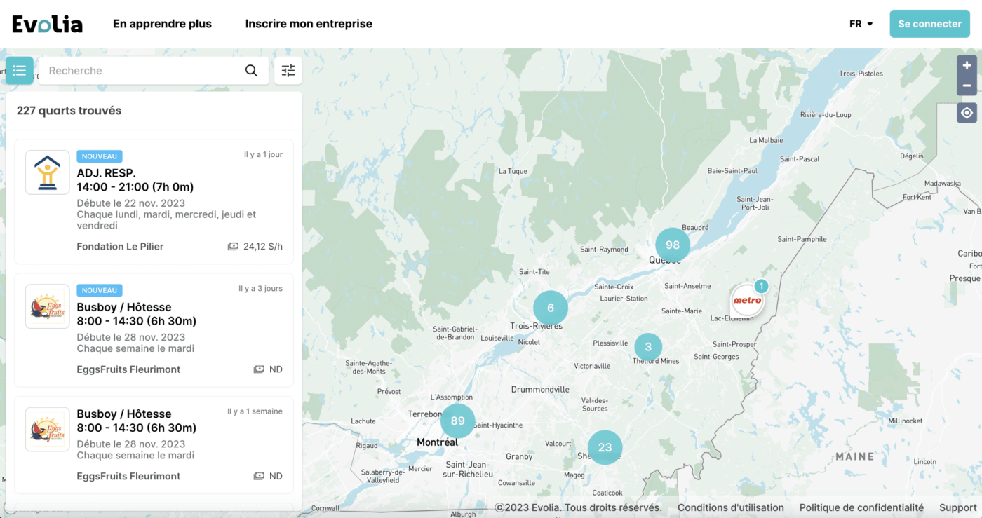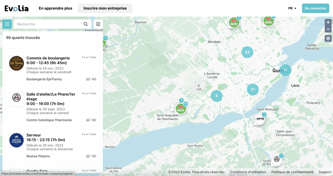 Naviguez sur la page de la Carte des Quarts pour explorer Evolia et visualiser les quarts de travail disponibles en temps réel.